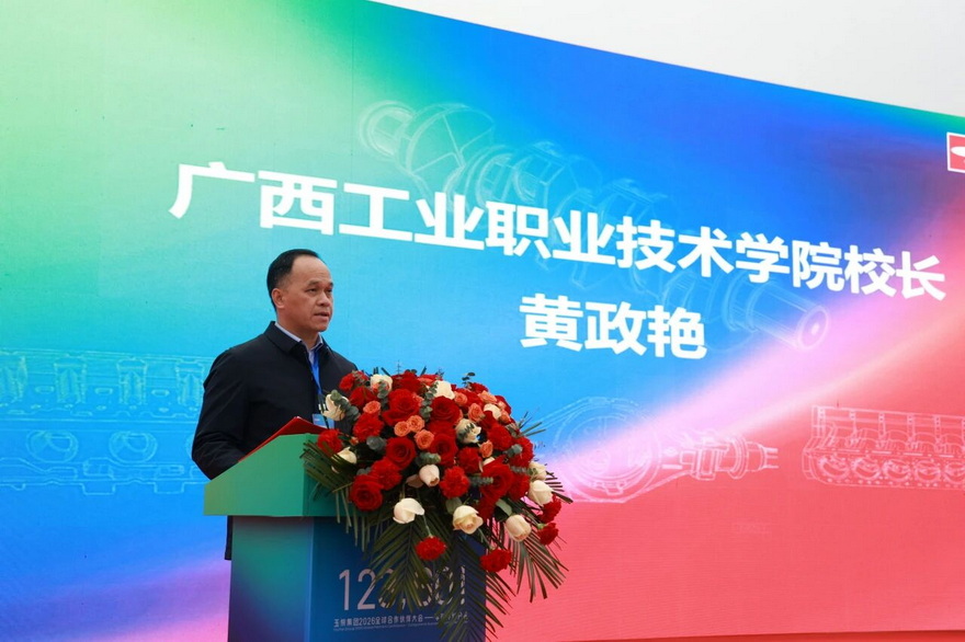 广西工业职业技术学院校长黄政艳介绍校企业合作成果,共建了“智能制造产业学院”,以“优势互补、共赢发展”为原则,助力玉柴取得了“全国职业教育教师企业实践基地”“广西产教融合型试点企业”等佳绩。